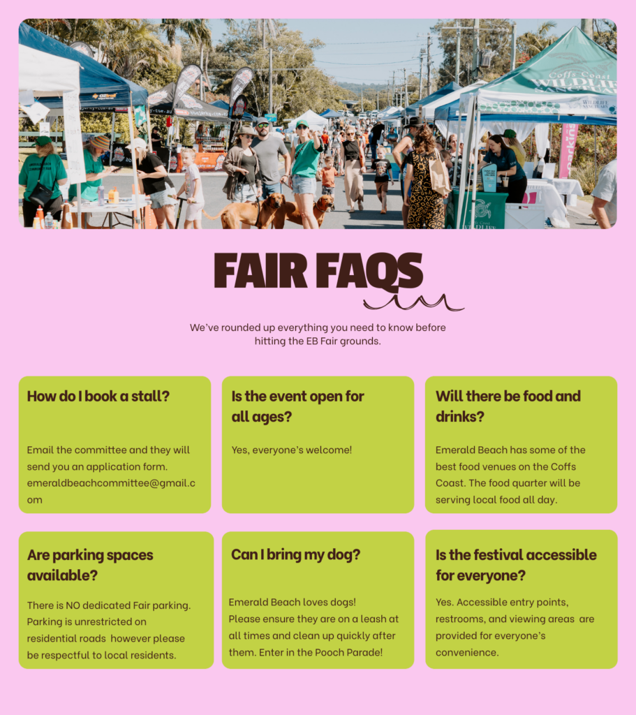 We will run the Fair in all-weather unless it’s dangerous. On the very rare occasion that we don’t run we will post on our Facebook page @emeraldbeachfair, the local Emerald Beach Families Group and our website emeraldbeachfair.com.au Stall holders will also be notified by email.